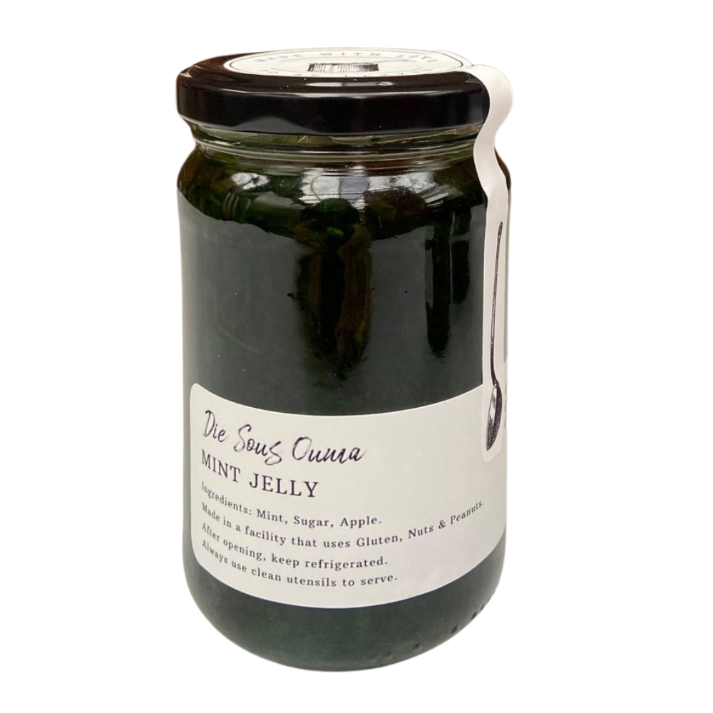 Die Sous Ouma Mint Jelly is made with fresh mint and is traditionally served with all roast lamb cuts and also goes well with beef or blue cheese.