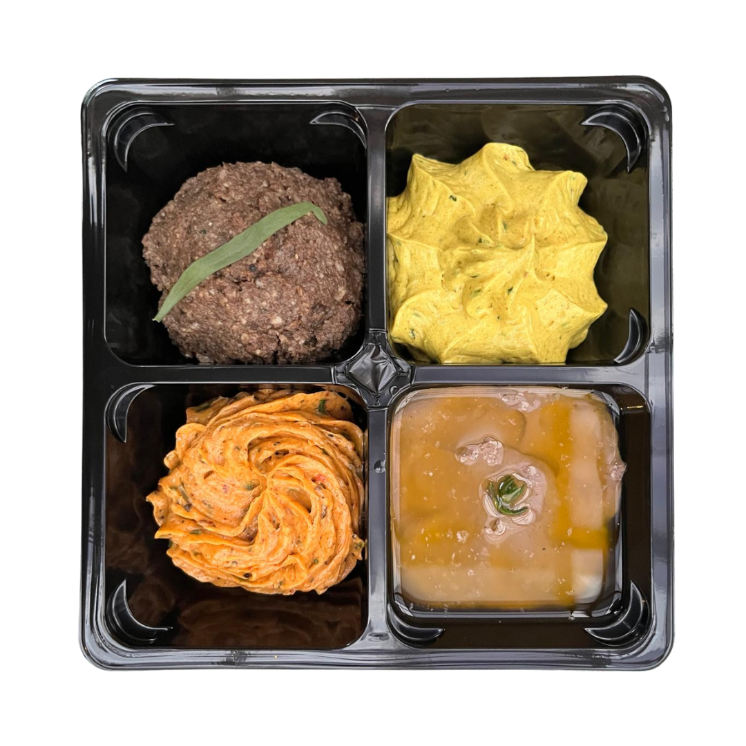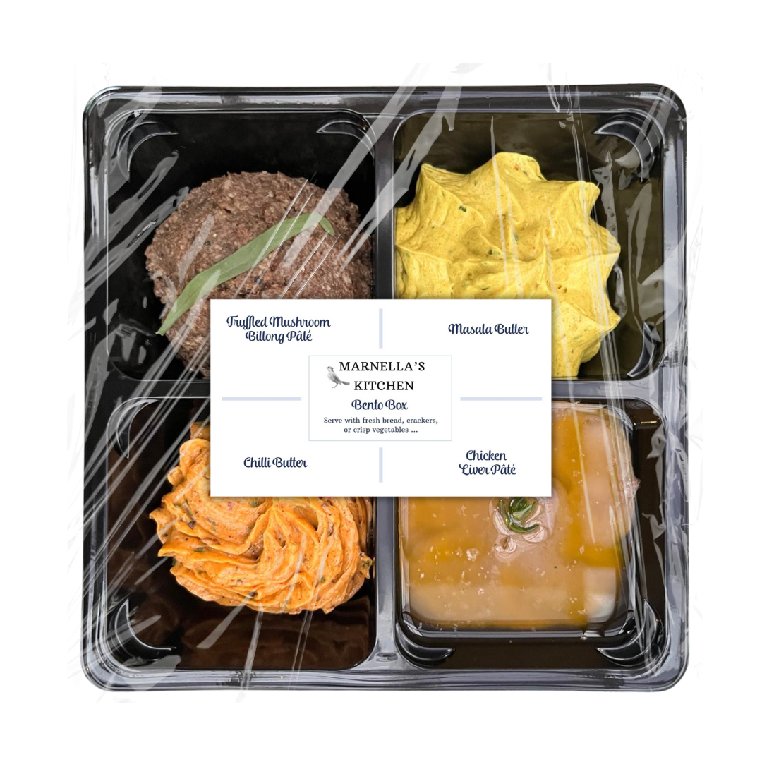 Start your meal in style with our Bento Box with Pâtés & Butters. This delicious selection features indulgent Truffled Mushroom Biltong Pâté, creamy Chicken Liver Pâté, fragrant Masala Butter, and zesty Chilli Butter. Perfect for sharing or savoring as a flavorful treat, it’s a gourmet experience in every bite!